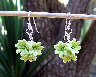 Description: delicate, handcrafted, polymer clay triple flower earrings in green, on twisted sterling silver wire hanging from sterling silver earwires.