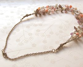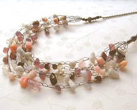A pretty 5-strand graduated wire crochet necklace with a selection of gemstones and glass beads in lovely shades of pinks, deep reds and purples. Crocheted using fine wire with a chain stitch and finished off with a delicate gunmetal chain, decorative filigree beads and a lobster clasp.